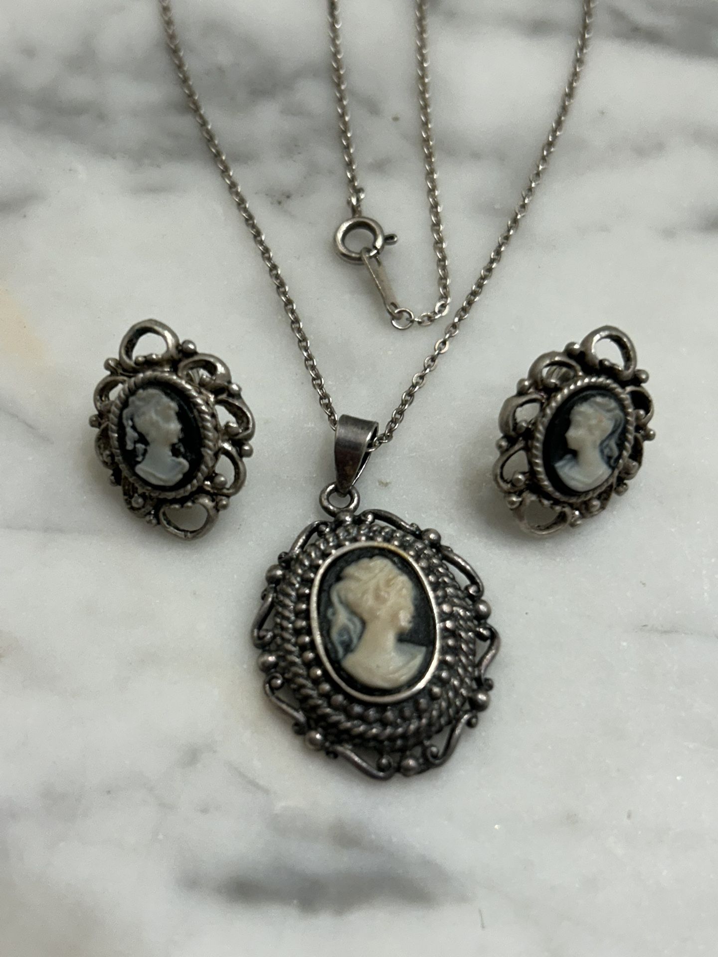 Vintage 925 Sterling Silver Cameo Pendant Necklace Earrings Antique Set Jewelry Piercing Ears Collectible Estate Find Rare Set Retro Signed