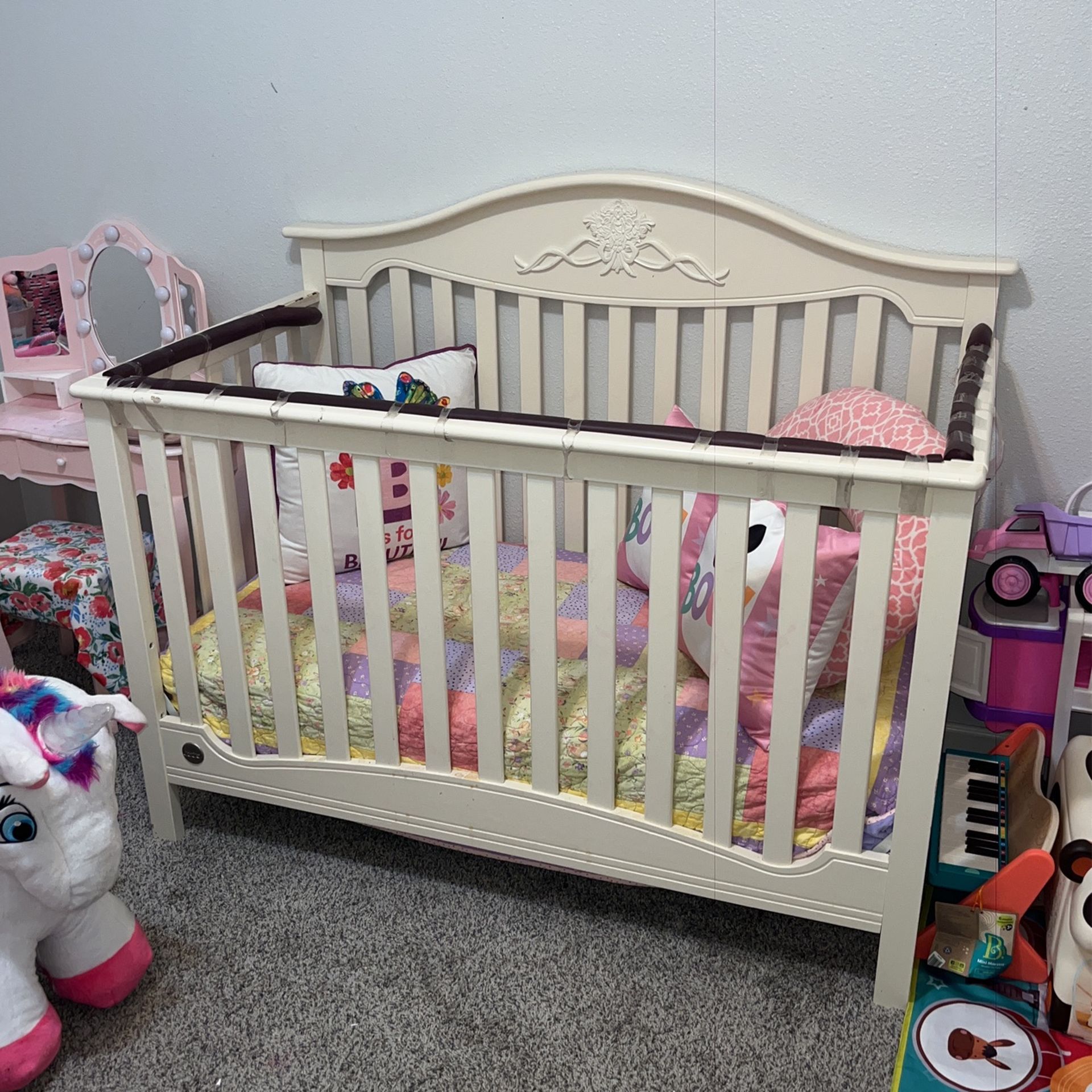 Used crib, white. Mattress is also included. Mattress is a waterproof on outer & I had a sheet protector on mattress at all times. Crib has 3 different levels for newborn to toddler. The purple lining you see around it was for bumper support to prevent injury. It is removable. Crib still does the job. ✅