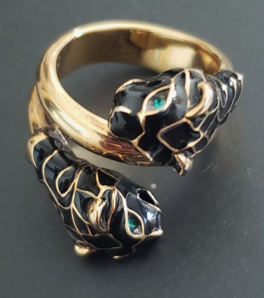Gucci Black Enamel & Crystal Double Tiger Head Cocktail Ring.