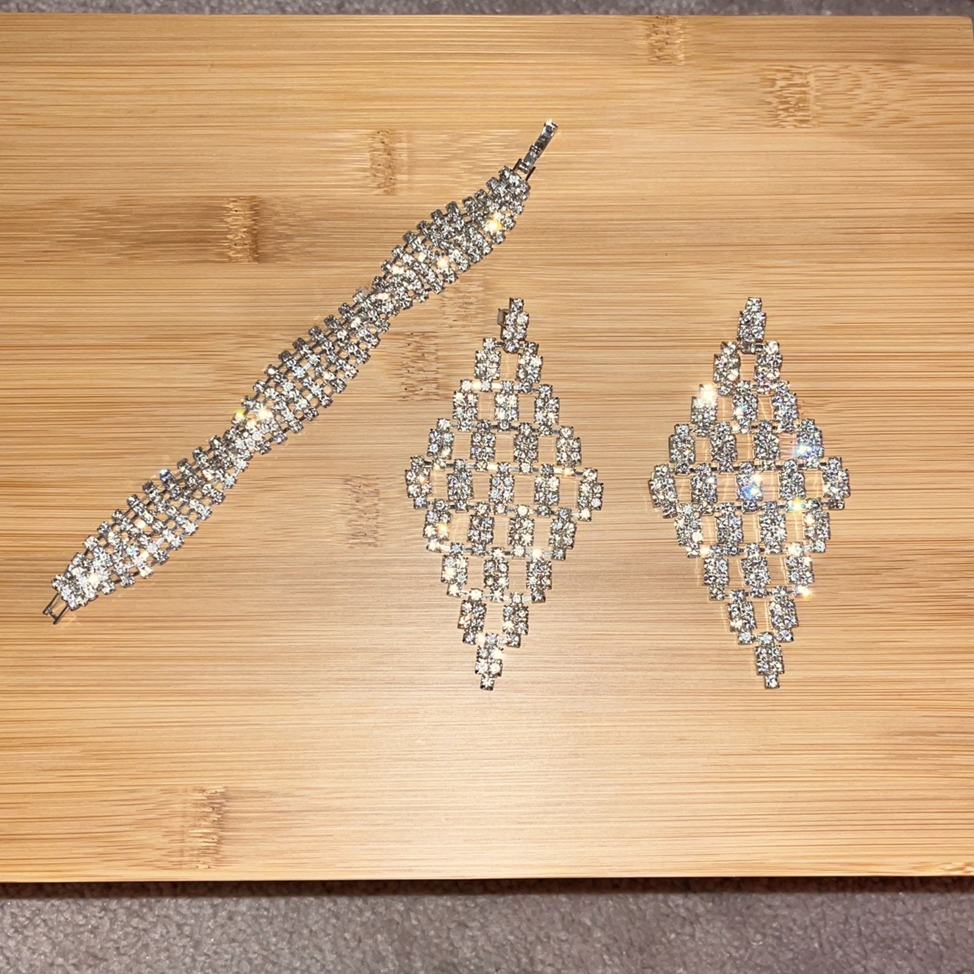 Diamond shaped rhinestone earrings. Knotted rhinestone bracelet. Can be sold separately.