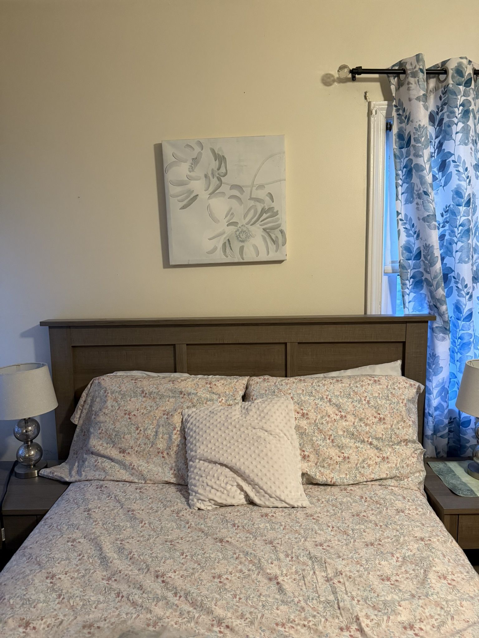Queen/full size headboard, in good condition, less than 2 years, 2 matching nightstands and dresser. Great space saving set, In mint condition. Only downside is that one drawer inside the dresser has sagged a bit but can be placed back. Selling because I’m looking to upgrade to different style of furniture.