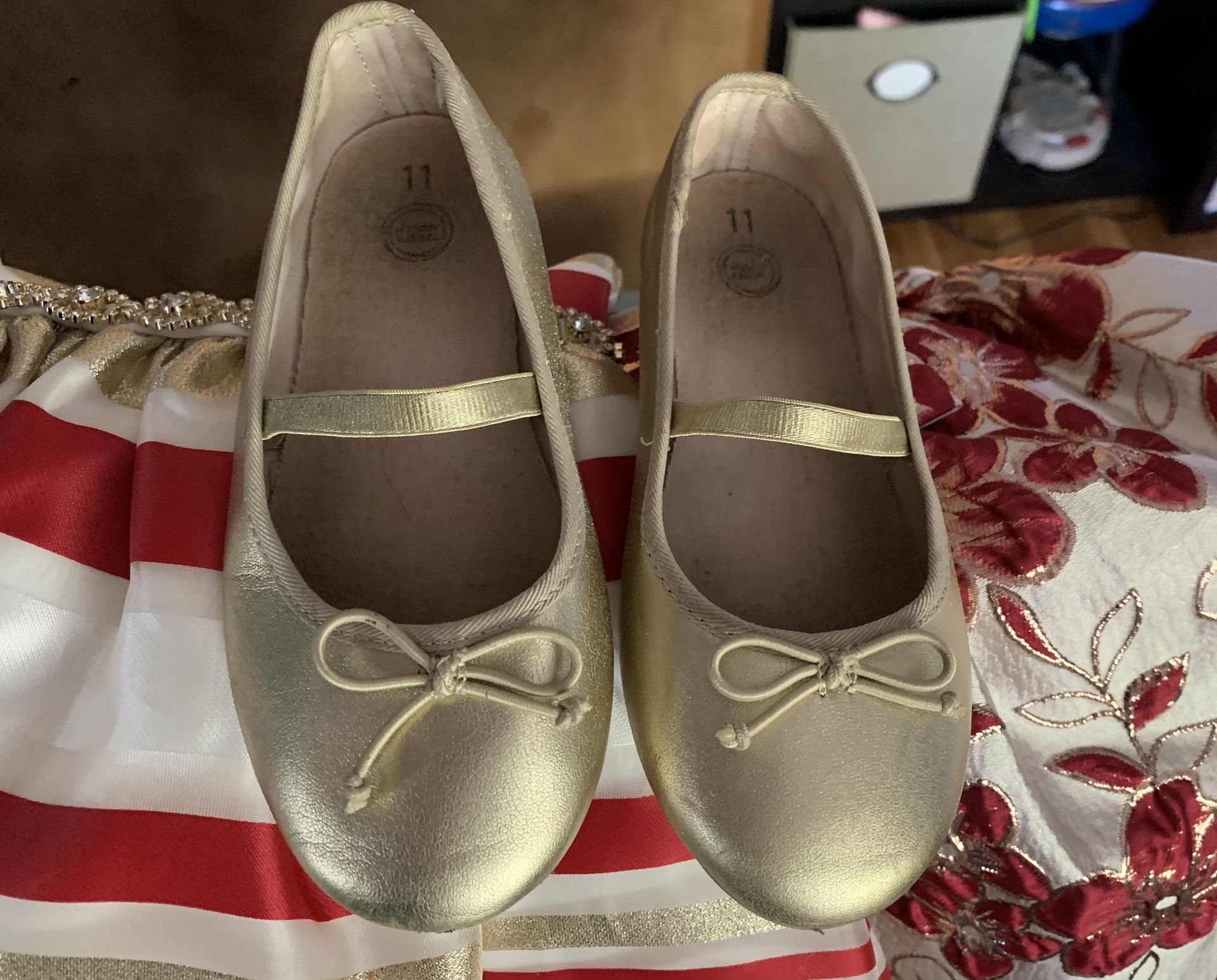 Little girls size 11 gold ballet flat with elastic strap. Gently used. Very good condition. Purchased new. Great for holiday wear, playing dress-up. From our pet-free, smoke-free home.