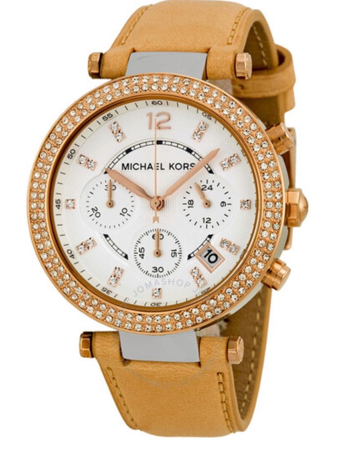 Brand new with watch box and tags Stainless steel case with a tan leather strap. Fixed rose gold-tone bezel set with crystals. White dial with luminous rose gold-tone hands and crystal index hour markers. Arabic numeral marks the 12 o'clock position. Minute markers around the outer rim. Dial Type: Analog. Luminescent hands. Date display between 4 and 5 o'clock positions. Chronograph - three sub-dials displaying: 60 second, 30 minute