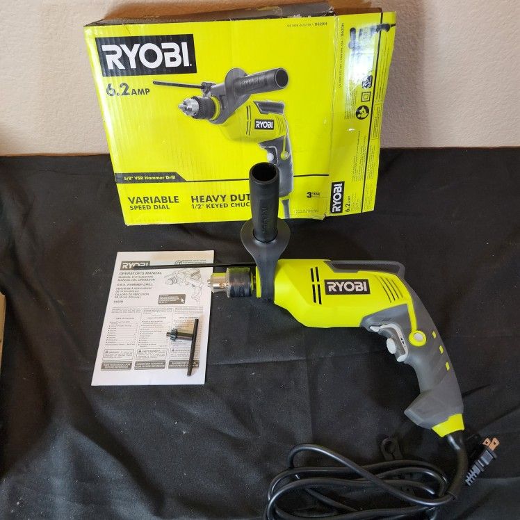 📢 ¡Hablamos Español! Open box RYOBI 6.2 Amp Corded 5/8" Variable Speed Hammer Drill. Never used, fully tested, and sold as‑is. Retail price: 79.99 This hammer drill is built for power and versatility, giving you the ability to switch between hammer mode for concrete/masonry and drill mode for wood, metal, and plastic. The 6.2 Amp motor delivers reliable performance, while the heavy‑duty keyed chuck ensures solid bit retention for demanding tasks. Designed for comfort and control, it features an ergonomic handle with GRIPZONE overmold, an auxiliary handle for stability, and a depth stop rod for consistent, accurate drilling. The variable speed dial and lock‑on trigger make it easy to match speed to the job and work continuously without fatigue. Highlights: • Hammer mode for masonry/concrete (5/8" capacity) • Drill mode for wood, metal, and plastic (1/2" steel capacity) • Heavy‑duty keyed chuck for secure bit grip • Chuck key with lanyard to prevent loss • Auxiliary handle for better balance and control • Depth stop rod for precise hole depth • Variable speed dial + lock‑on trigger • 6 ft. cord for convenience • Includes hammer drill, auxiliary handle, depth rod, chuck key with lanyard, and manual Taxes and fees included.