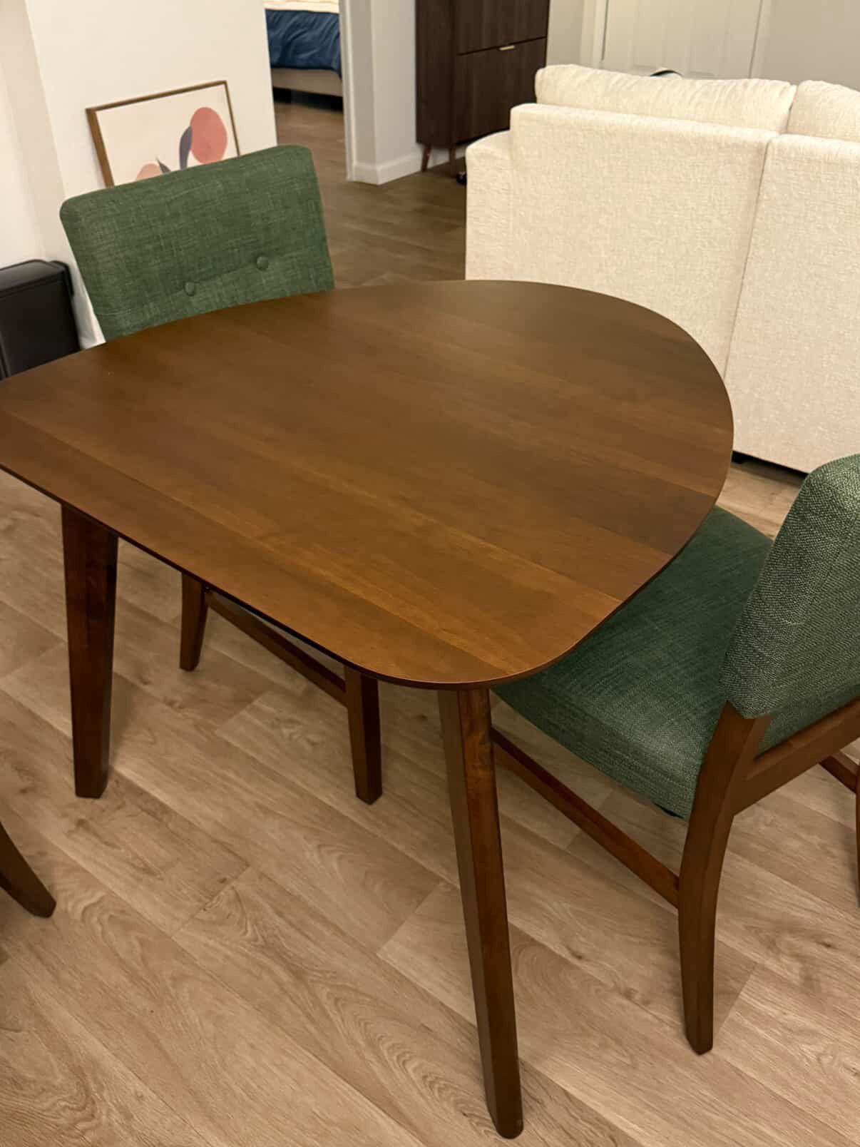 3 Chairs (Olive green color) and Walnut colored Dining table. Great condition. Minimally used. No pet contact.