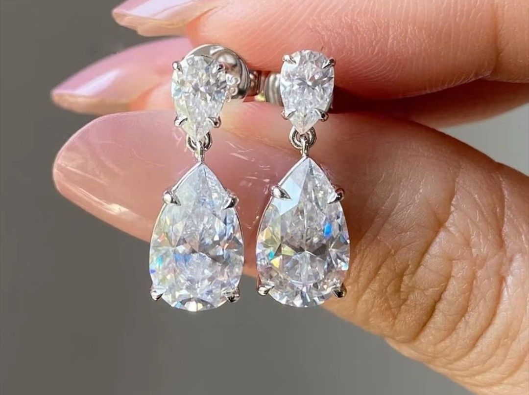 Each earring is 3.3 carats of high quality VVS1 Clarity / D color / Excellent cut , Polish , symmetry and overall Grading. setting type is prong with 18K White Gold Vermil over Solid sterling silver. Passed two Diamond tests. 1st passed as Diamond on Diamond tester & other test they passed on Moissanite/Diamond tester as Diamond.