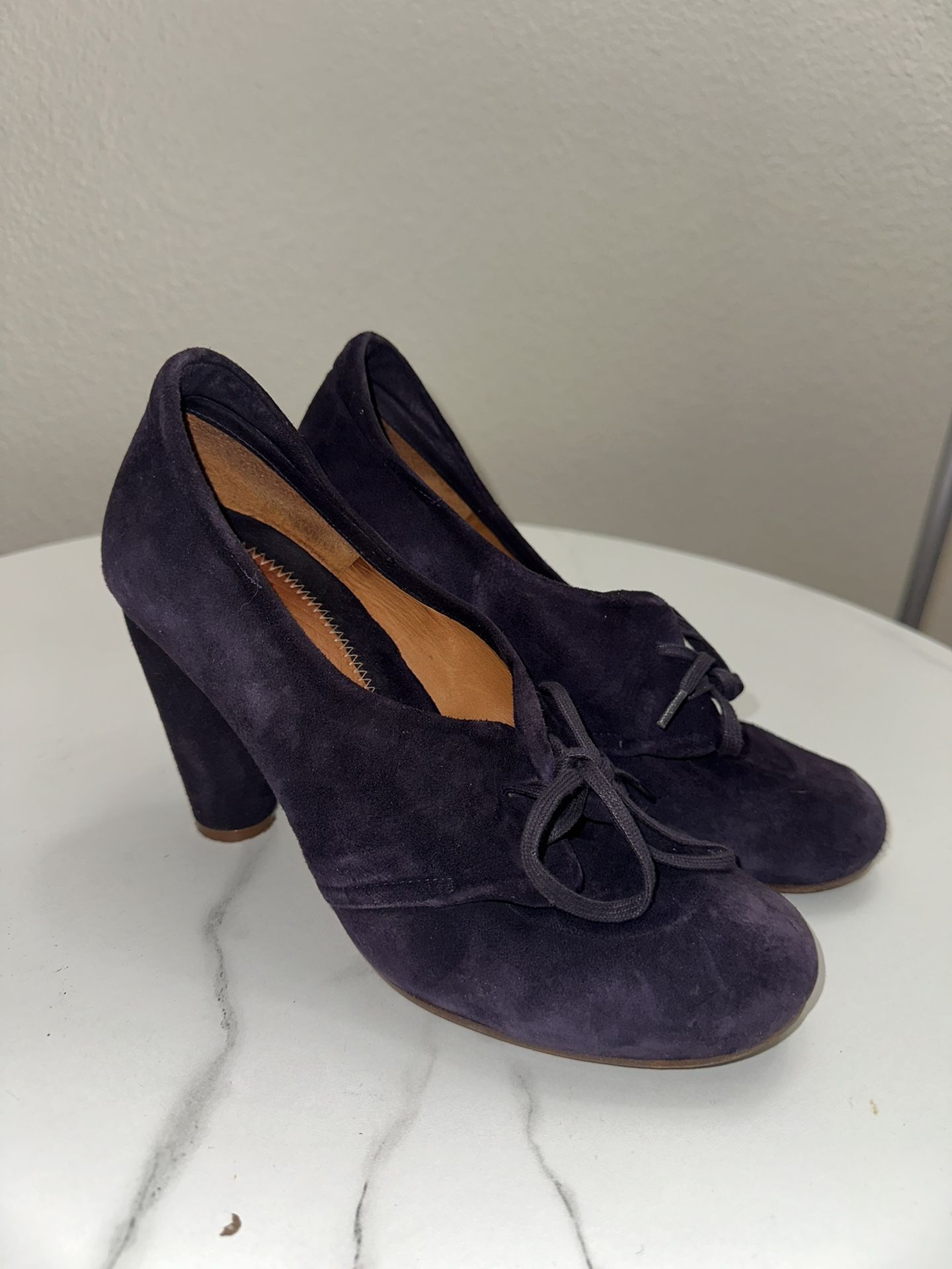 Elegant Women’s Purple Suede Heels – Size 37 (Made in Spain) Beautiful and stylish purple suede heels with a chunky heel and lace-up front. Crafted from genuine leather and made in Spain, these shoes offer both elegance and comfort. Lightly used and in great condition. Perfect for work, events, or a night out. Details: • Size: 37 (fits US Women’s 6.5–7) • Material: Genuine leather & suede • Color: Deep purple • Made in Spain • Comfortable chunky heel
