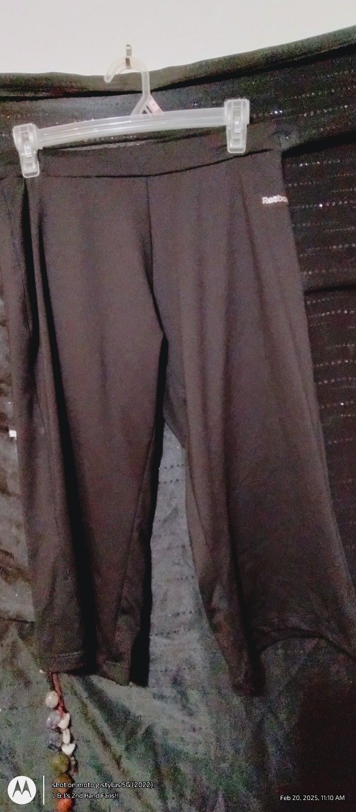 Reebok women's Basically new condition Black Play Dry lounge /workout capris Elastic waist w/small tiny pocket inside by Waist hem Polyester and spandex Size med but fit more like a large