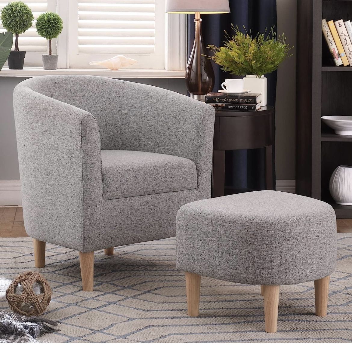 Accent Chair with Ottoman, Mid Century Modern Barrel Comfy Fabric Armchair and Footrest Set, Upholstered Club Tub Round Arms Chair for Living Room Bedroom Reading Room, Grey Product Dimensions 25.5"D x 27"W x 28.5"H Bought 3 months ago! NEW