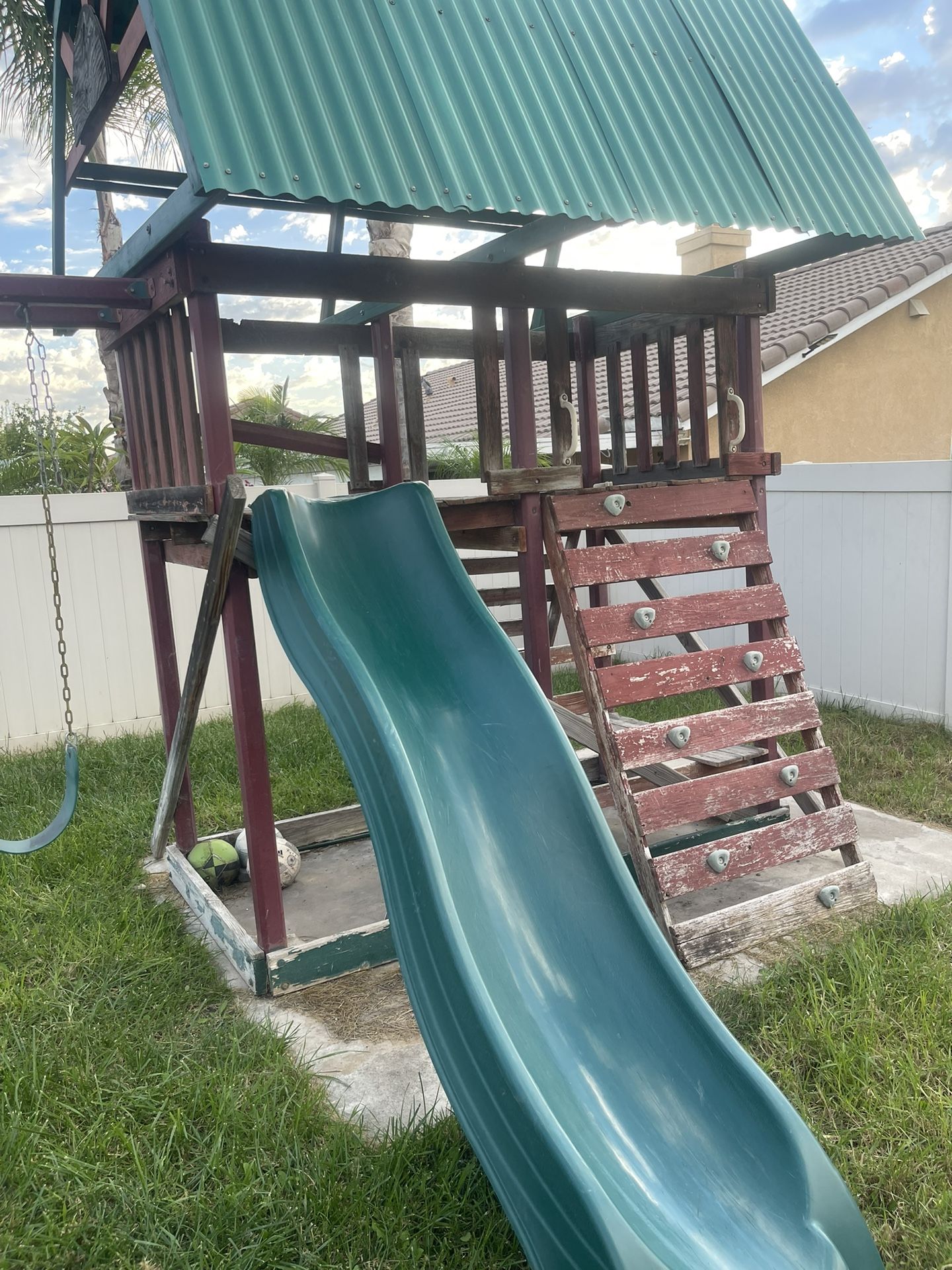 Full built playground house You will need to disassemble it yourself (pretty simple deconstruction) Green slide can be sold separately (90$) or message me if you want something specific and offer. Possible repairs you might need to do: New paint Replace wood if you want A step bar on the monkey bars is broken.