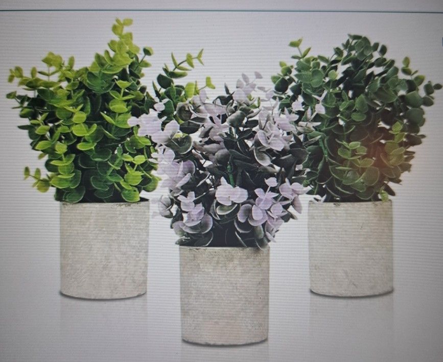 Artificial plants, great for Bathroom, office, desk... they come in box, never used, brand new. 9 inches tall, and 3 inches wide. Please see second Picture for dimensions