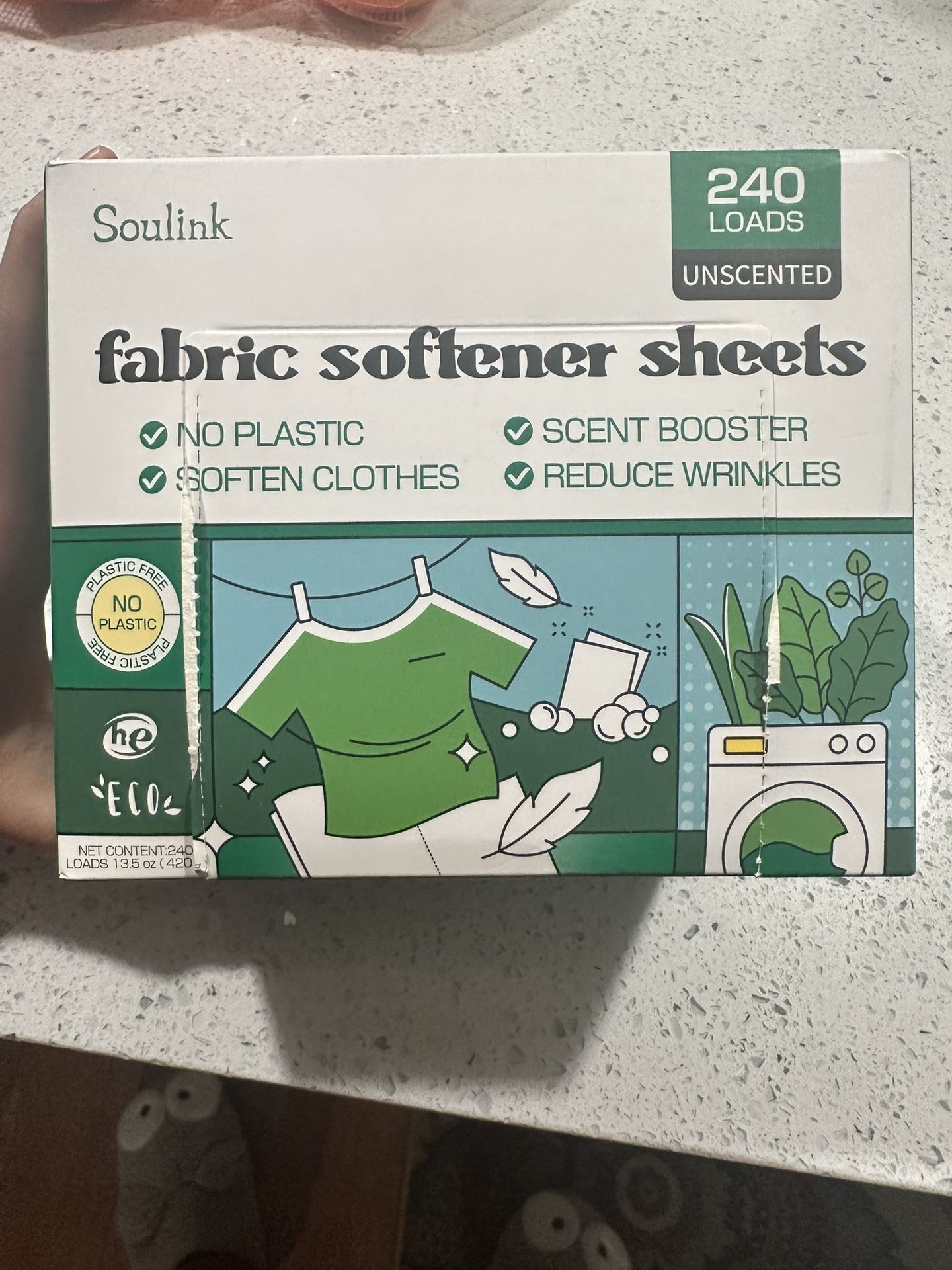 Soulink fabric softener sheets with 240 loads. Unscented and eco-friendly. Features include no plastic, softens clothes, scent booster, and reduces wrinkles.