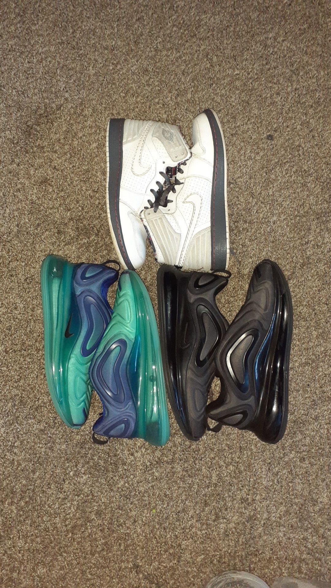 Blue and green Nike air max 720 9/10 condition small scuffs on heel one white one as pictured SIZE 6.5 85 OBO Black Nike air max 720 7.5/10 condition scuffed in the back and little scuffs on shoe Pretty good condition just worn more than the others SIZE 6.5 70 OBO Jordan 1 retro bugs bunny 8.5/10 condition the suede is a little brown and dirty but overall the shoe is clean SIZE 7 75 OBO OR 200 FOR ALL OBO