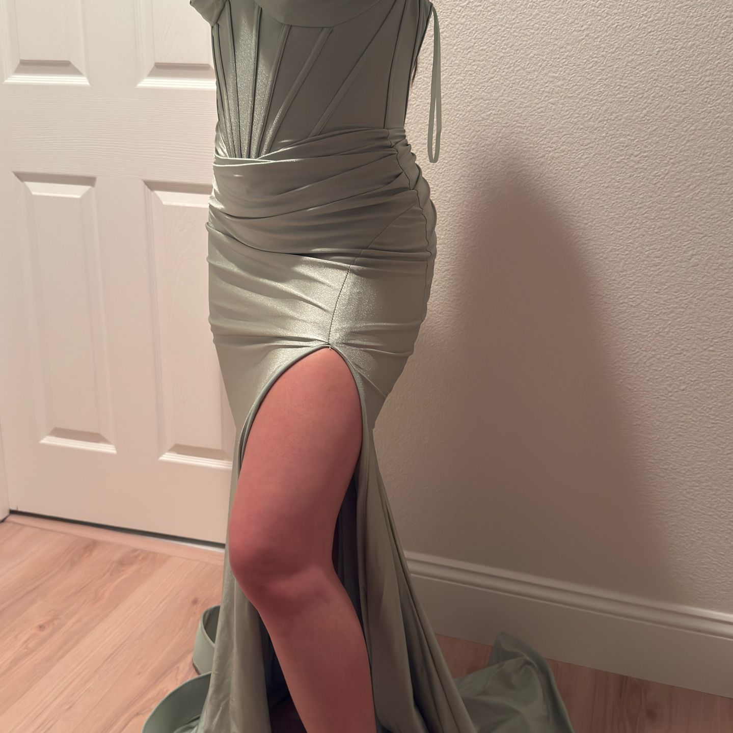 Brand new sage green dress unworn except for samples shown in pictures. Dress still has tag on it. We changed our mind and no longer will be using this dress. Needs to go ASAP. SIZE: 2