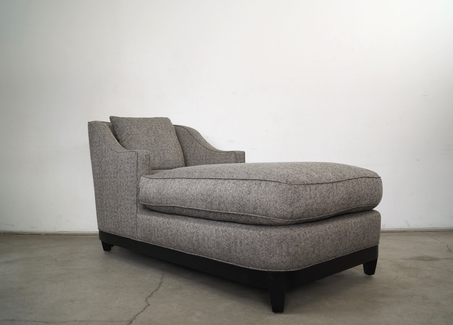High end chaise lounge chair for sale. Manufactured here in Los Angeles by high-end designer company A. Rudin, and is the 2650 chaise lounge. It's an incredibly well built daybed sofa with a down filled cushion and throw pill. It has a solid wood rounded base in an ebony finish, and a gray tweed. The tweed is beautifully woven with dark and light gray. This daybed is extremely comfortable, and and a beautiful design with Art Deco and Mid-century influences. If you're familiar with A. Rudin pieces, you'll recognize the quality and craftsmanship that is their trademark. It's in excellent condition. The measurements are 33" wide x 19" seat height x 33" tall x 70 1/2" long Delivery can be arranged. Please check my other listings! π Mcm mid-century Midcentury modern art deco Hollywood regency