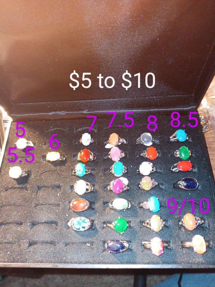 I have a group of natural gemstones on stainless steel band rings. The ring sizes are listed above each row of rings. The rings are priced between $ 7 and $10 each if you by 4 or more I will cut you a deal. These are pretty decent rings for being costume jewelry. There are some real neat ones to choose from. If you wanted to by foul I will let you include any other jewelry that I have listed on my profile dashboard as well. So it don't have to be just these rings as long as it's four pieces of jewelry. I will make you a good deal. Please refer to pictures for further details on this particular set of rings. Must be able to pick up in Lakewood.