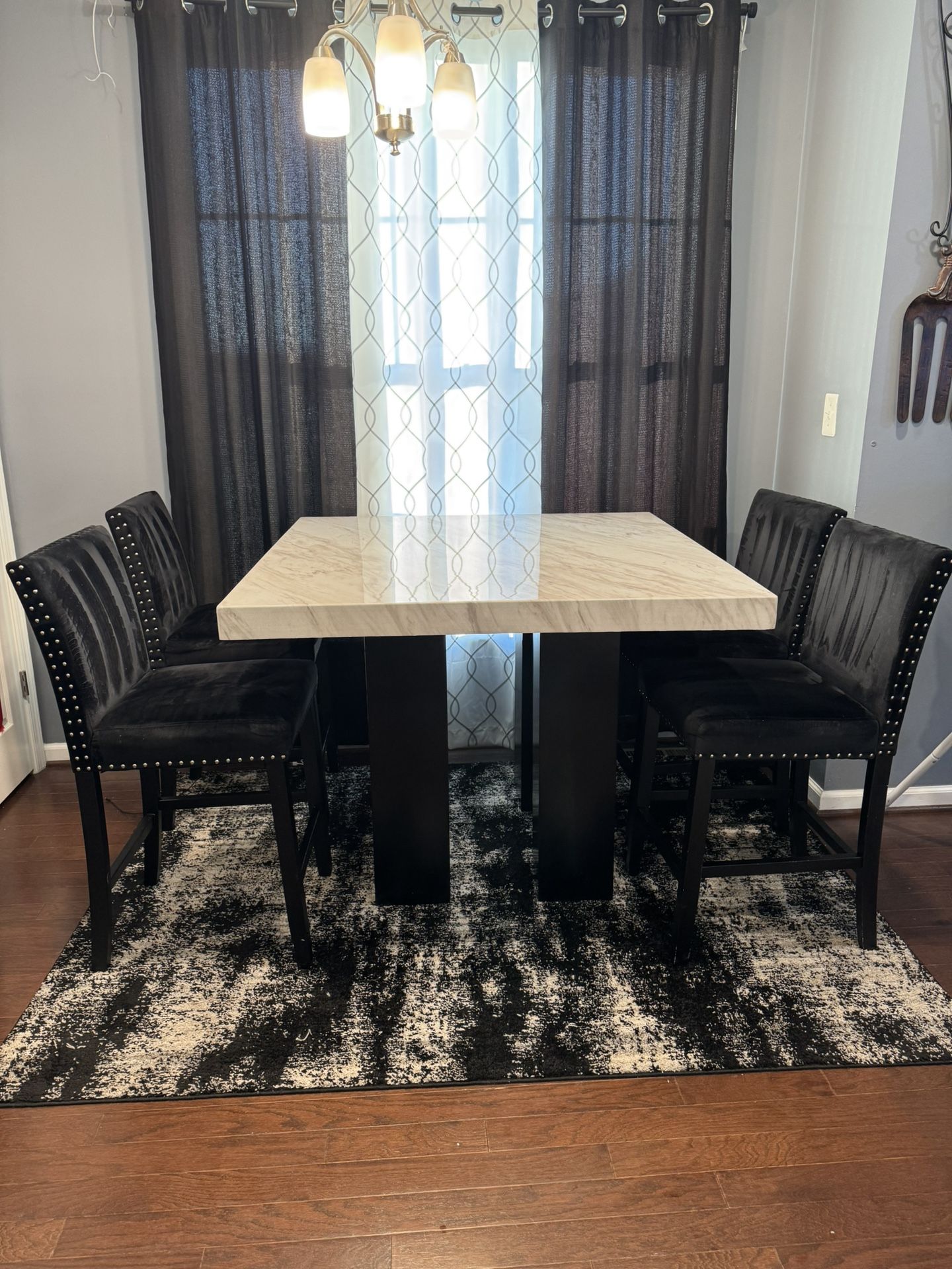 Beautiful dining table with four chairs black velvet chairs with marble table I’m moving and I need to sell everything.