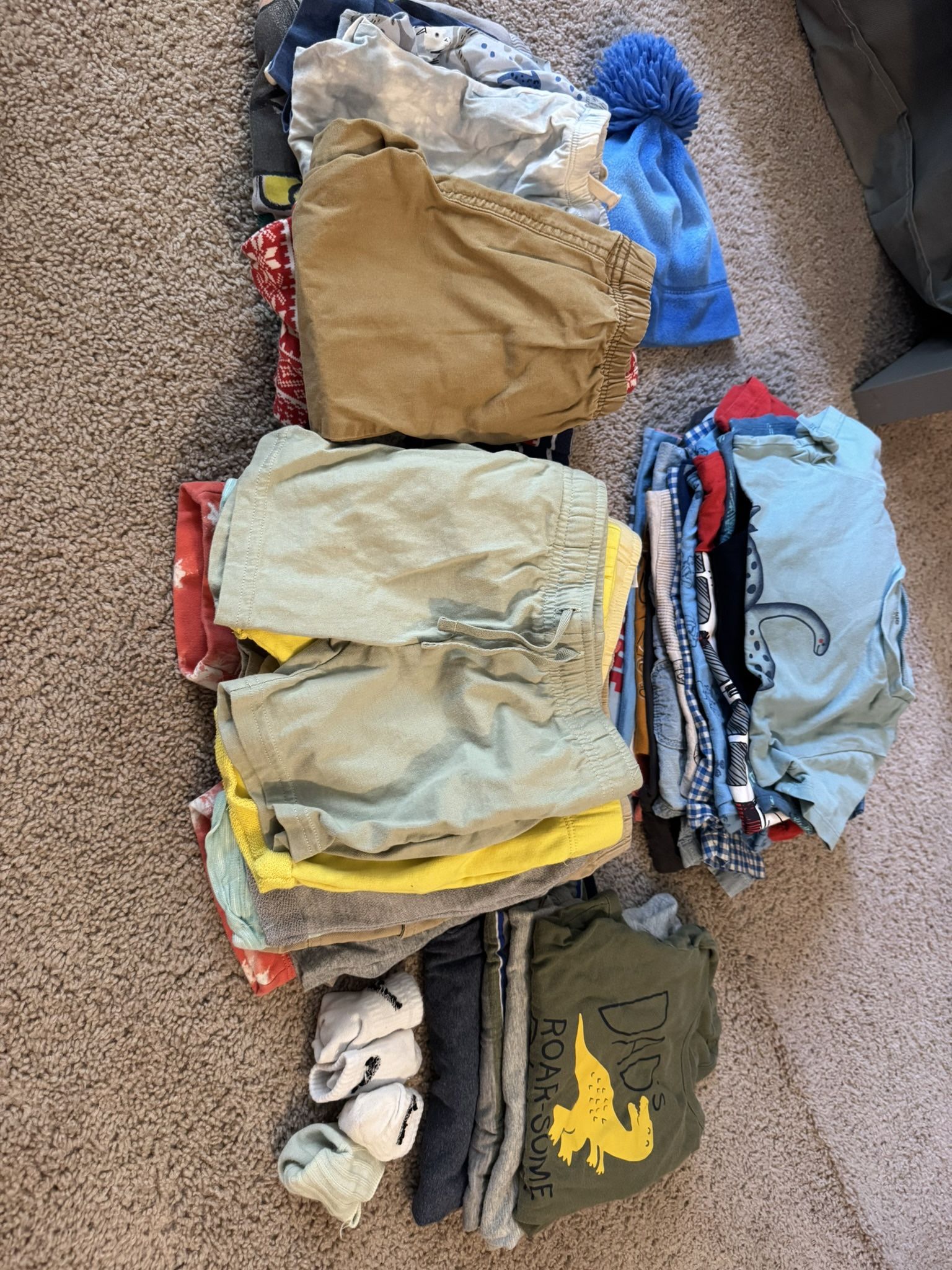 Lots of boy clothes from 18 months to 2T some 3T It’s a big bag of clothes is other stuff in their sweater shirts, pants sweats, pajamas for this cold weather right now lotta good stuff If you’re picky, please don’t ask. Nothing is ripped.
