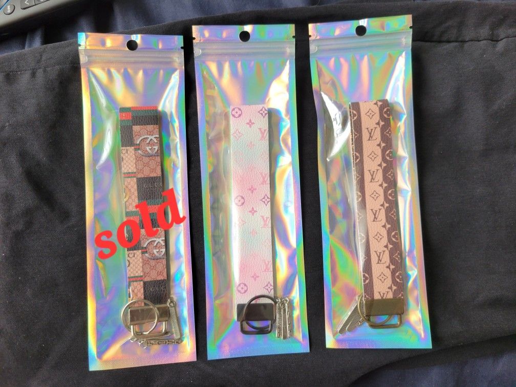 cute for stocking stuffers! approx 6" x 1" wristlet keychain with glitter back. comes with 3 charms you can add to the keyring or use separately on a bracelet or necklace. $15 ea, pick up in Salt Lake