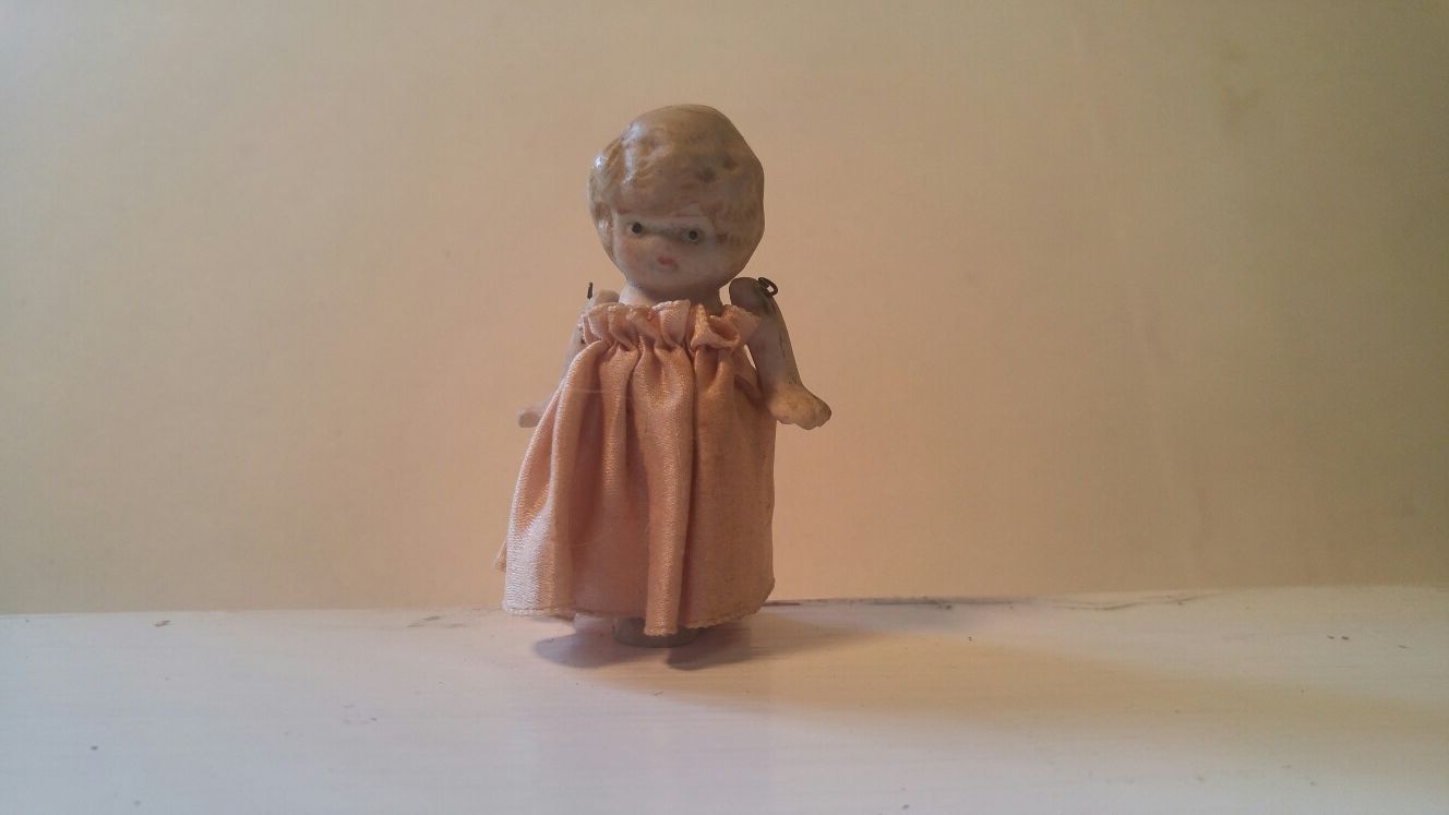 Up for sale is an antique Penny Bisque Porcelain Doll, also known as a Japan Flapper Blond Doll. This small vintage bisque flapper doll stands on her own at 2.5 inches tall and dates to Japan in the 1930s. $10 OBO! She has a pink silk dress and curly hair molded into the porcelain, and she has "MADE IN JAPAN" impressed in her back beneath the dress. The small figurine is made of bisque porcelain along with a little wire to allow the porcelain arms to move, rotate, and swing at the shoulder joints. This charming little vintage doll is in good condition considering its 80+ year age, although the paint coloring her hair blonde has faded with the years. The doll retains its painted pink blush cheeks, red lips, blonde eyebrows, and black pupils in her eyes. $10 OBO!