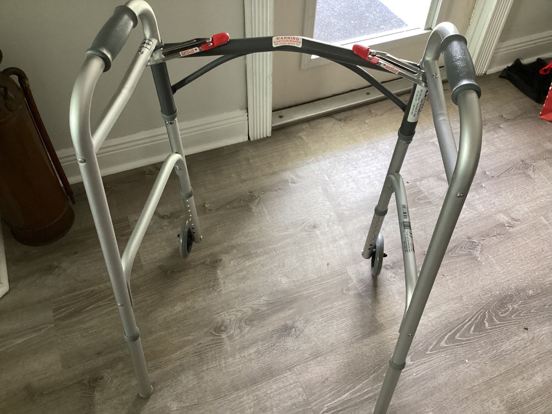 Deluxe Folding Walker, Two Button with 5" Wheels Gently Used One Like New $18