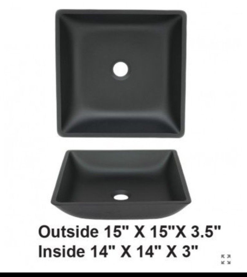Matte Black Tempered Glass Vessel Sink NEW, never used (floor model from showroom) Retails: $250 Asking only: $175 Overall Dimensions: 15'' x 15'' x 3.5'' Inside Dimensions: 14'' x 14'' x 3'' Drain Size: 1.75" Installation Type: Vessel Bowl Shape: Square Material: Glass