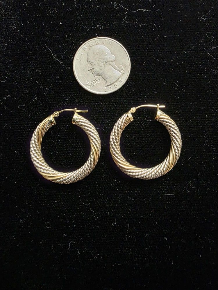 Solid 14K Gold And Sterling Silver Twisted Hoop Earrings Weighs approximately 5.80 grams total weight Marked 14K and 925 See photos for details