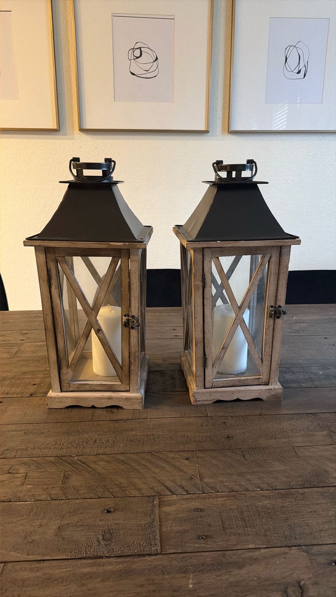Rustic wood and metal lantern holders with a front latch with glass farmhouse style side detailing.