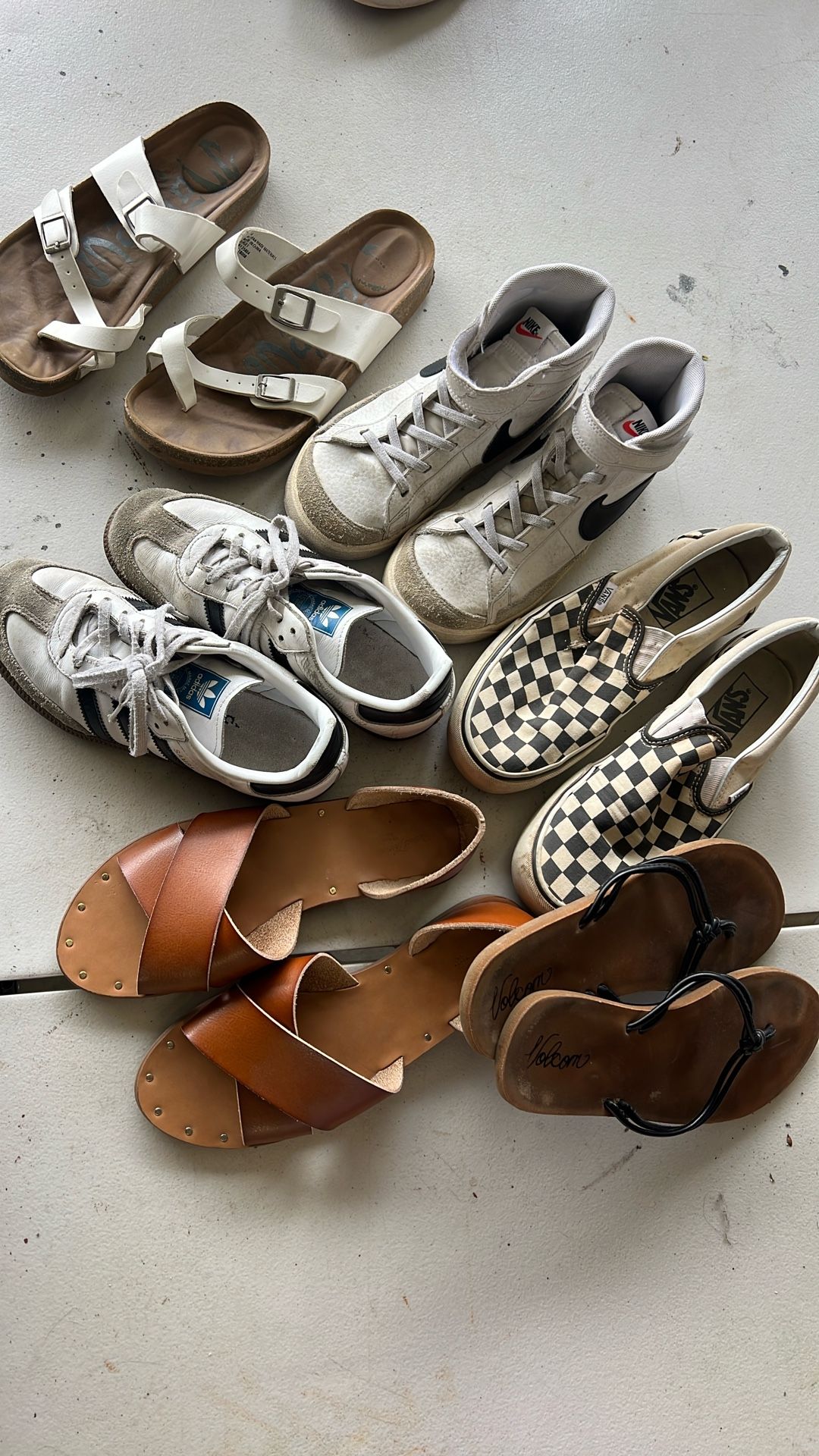 All shoes for $15 Or each pair $4 Sandals 81/2 women’s Vans 81/2 women Nike blazers 3 kids Samba adidas 4 kids -sold!