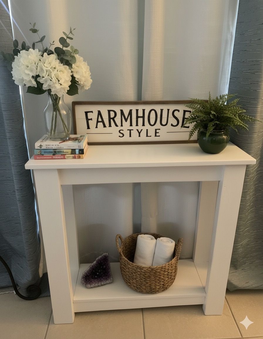 Cute and simple white farmhouse-style table that looks great in any room! It’s perfect for an entryway, hallway, or even behind a couch. The top has plenty of space for décor, and the bottom shelf is great for baskets or extra storage. It’s sturdy, clean, and in great condition — ready to go to a new home!