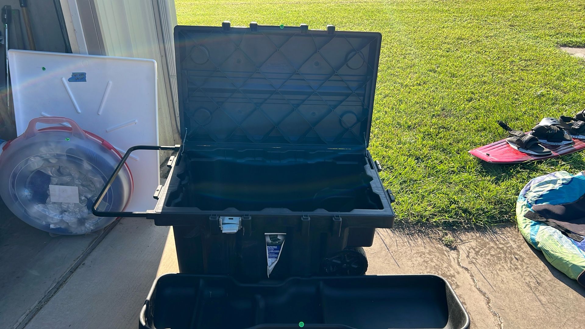 Storage tote with wheels. Needs new latch. $100 new