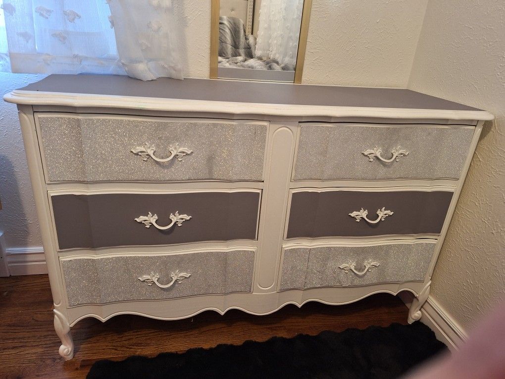 Refinished in white. The gray and silver is just paper which can be removed if you don't like it.