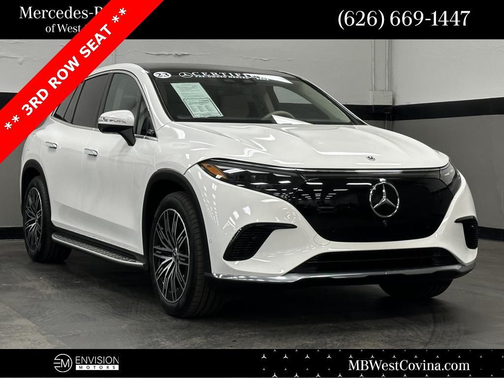 ** 3RD ROW SEAT **** 21'' PREMIUM WHEELS **Recent Arrival! Certified. CARFAX One-Owner.3rd Row Seat, Navigation system: MBUX Augmented Reality for Navigation, Premium Trim Package, Wheels: 21"" x 9.5J AMG® Multi-Spoke.Polar White 2023 Mercedes-Benz EQS 450 4D Sport Utility Electric Motor RWD 1-Speed AutomaticMercedes-Benz Certified Pre-Owned Details: * Transferable Warranty * Limited Warranty: 12 Month/Unlimited Mile beginning after new car warranty expires or from certified purchase date * Warranty Deductible: $0 * Roadside Assistance * Includes Trip Interruption Reimbursement and 7 days/500 miles Exchange Privilege * Vehicle History * 165+ Point InspectionWe probably speak your language! Call us at (844) 314-4913.Mercedes-Benz of West Covina is looking forward to assisting you in the ways in which match your automotive needs. To learn more about the products and services that our team provides, we welcome you to visit our showroom at your earliest convenience. Housed nearby at 2010 East Garvey Ave. South West Covina, California we're happy to continue the conversation and answer any questions.Burmester® is a registered trademark of Burmester Audiosysteme GmbH, Berlin, Germany. Harman/kardon® and Logic 7 are registered marks of ""Harman International Industries, Incorporated."" Bluetooth is a registered mark of Bluetooth SIG, Inc.