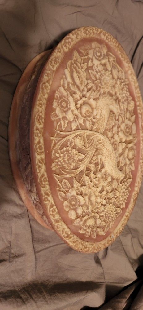 Up for sale is a genuine incolay stone jewelry box with a brass hingle and velvet lined bottom. It is pale pink and white with birds and flowers in the design. Pick up near Yorktown.