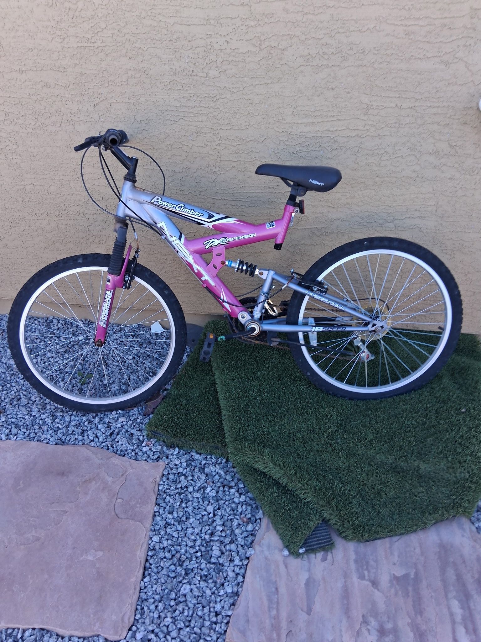 Pink NEXT Power Climber 26" Women's Mountain Bike: Frame: durable, steel frame Handlebars: steel Suspension: full Gearing: 18 speeds Derailleur: Shimano Seat: height adjustable, cushioned seat Brakes: front and rear V-brakes Brake Levers: alloy Tires: knobby Rims: alloy Pedals: steel Dimensions: 64"L x 24"W x 42"H