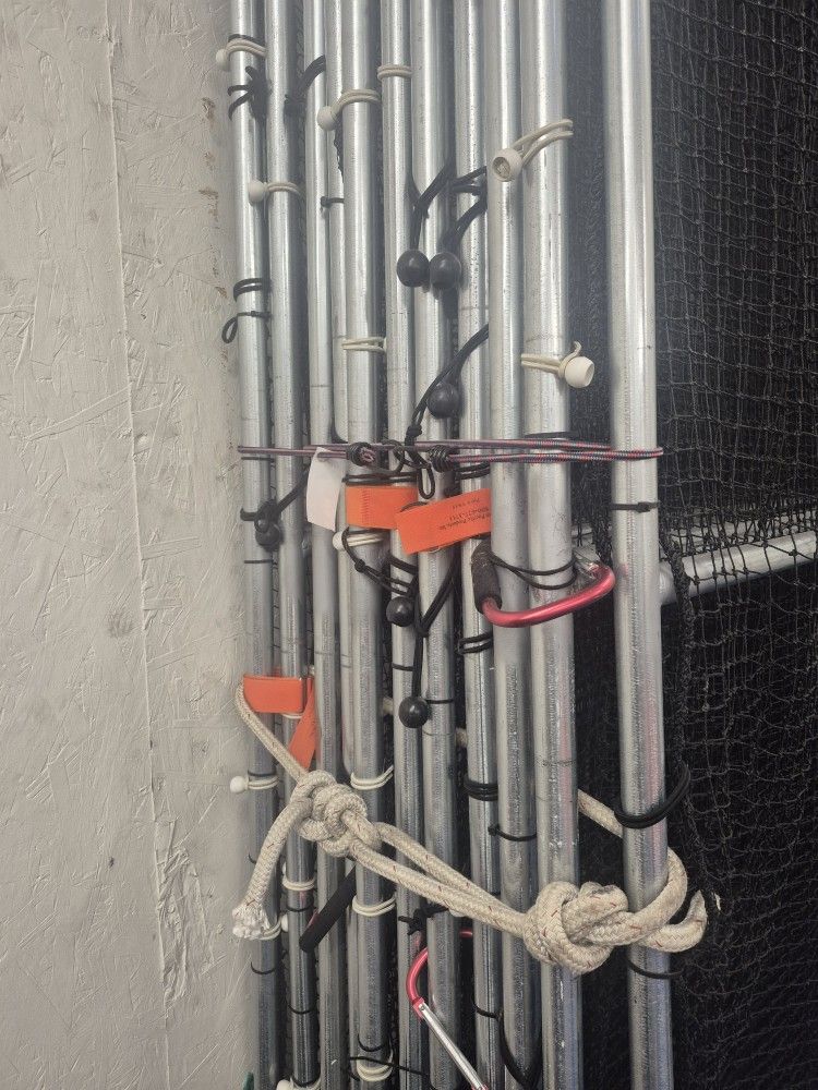 10x55 batting cage galvanize frame work with netting designed to fold up to wall when not in use i had this in my shop need to have minimum 10ft ceilings or set up on exterior of building