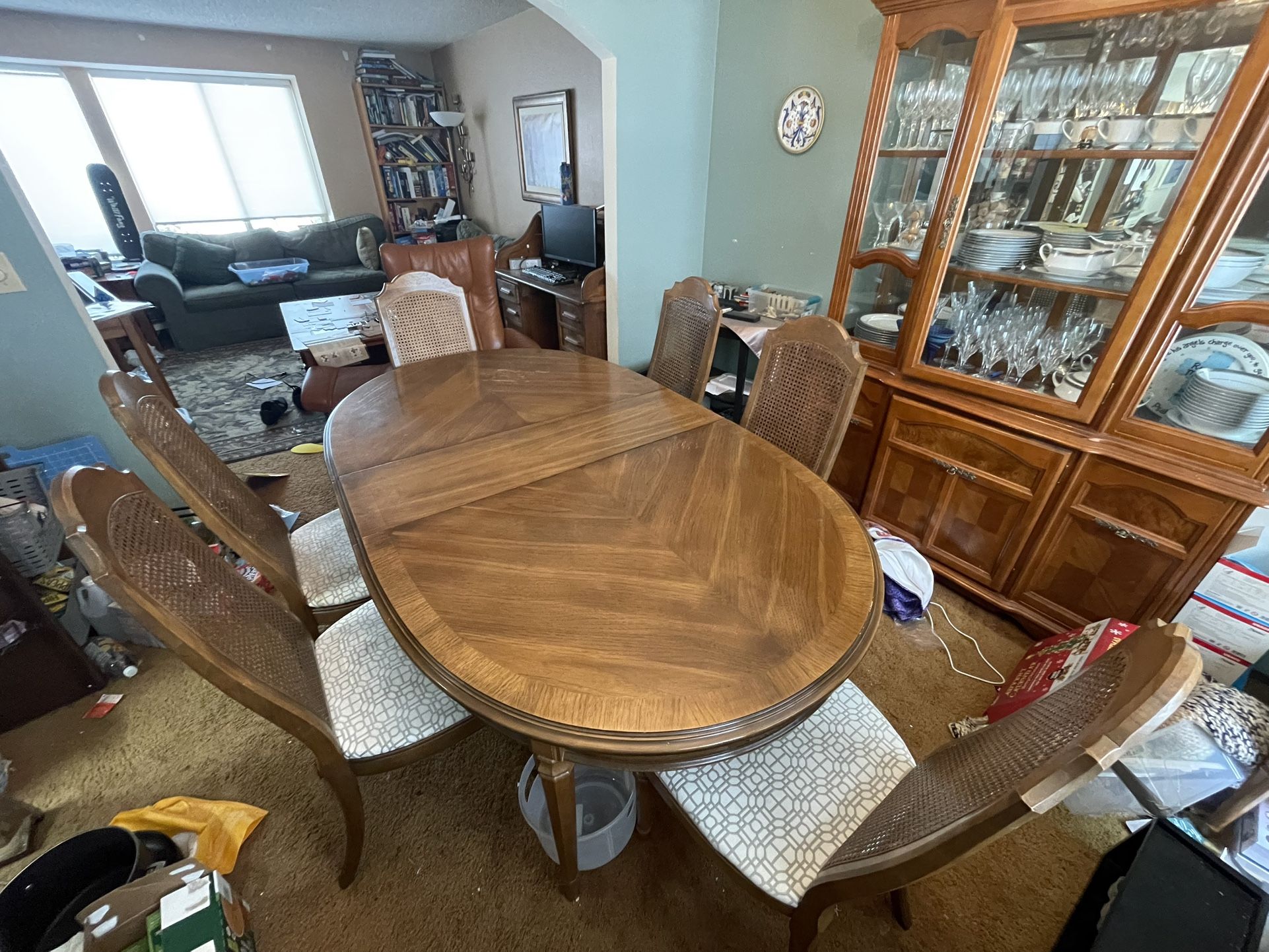 Selling as a set - $2500 OBO: Drexel Heritage Esperanto Extendable dining table (and 3 leaves) & table pads + (10) Drexel Heritage Louis XVI cane back chairs - two with arms, 8 without arms. Not a typo! A huge set! *not all chairs are shown in photo - sorry. Table as shown in photo (with one leaf) is 76" L x 44" W. Each leaf adds 12" length to the table. This is in moderate condition - some blemishes, but a rare find. I cannot break chairs up into smaller sets, nor break up table/chairs. I'll take offers but please no lowball