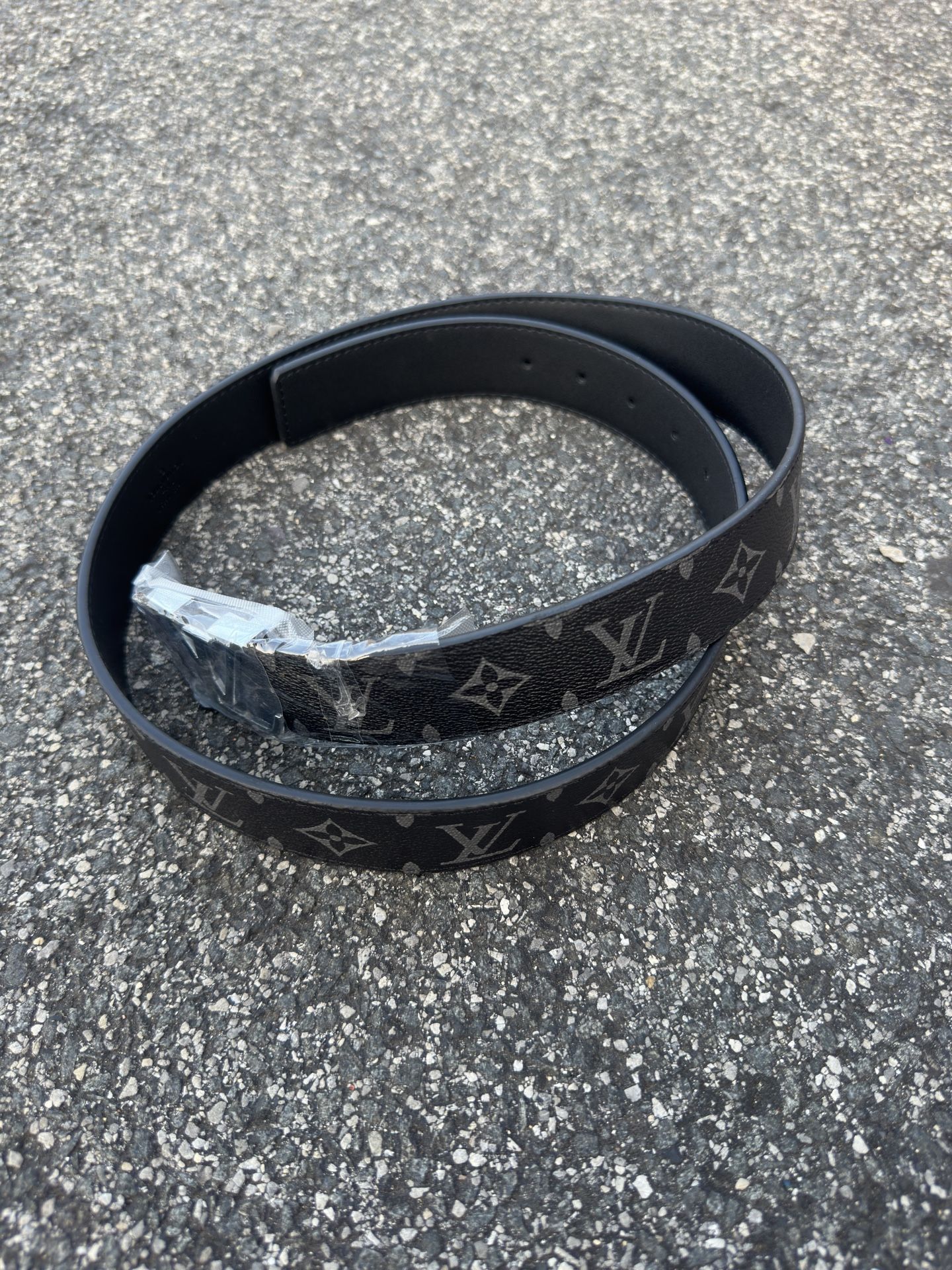 Features a black colorway with the iconic monogram pattern. Leather belt with a buckle closure. A great addition to elevate any outfit.