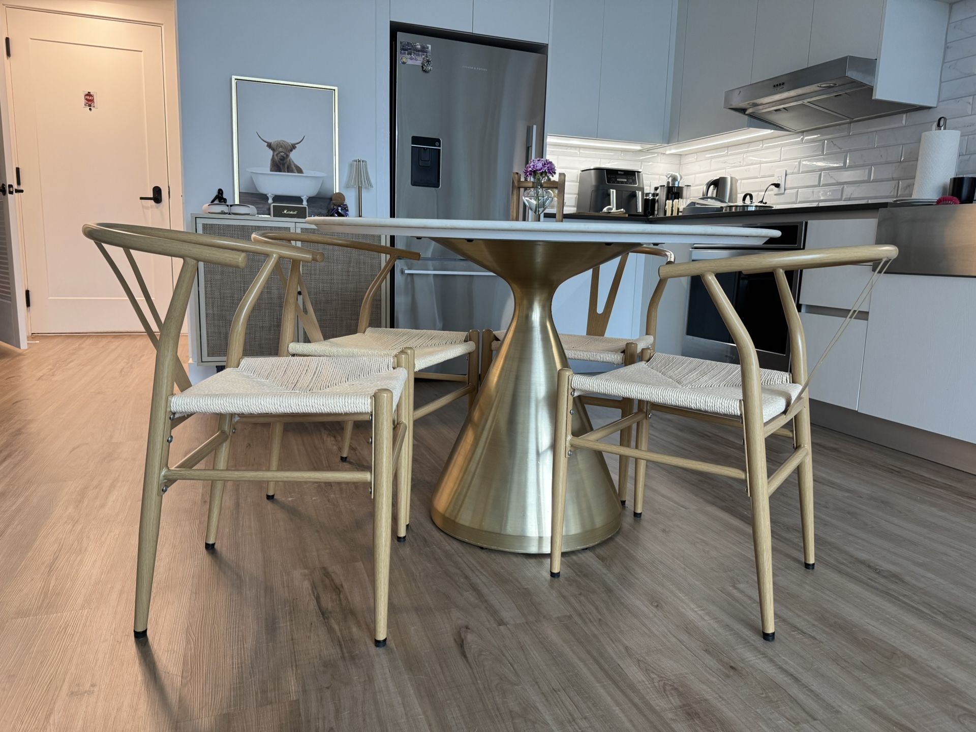 Beautiful and elegant Silhouette Pedestal Marble Round Dining Table (48") originally from West Elm ($1,699 new) paired with 4 stylish, comfortable dining chairs (not West Elm). This set adds a modern and timeless touch to any space. Table: Genuine marble top, solid and heavy, pedestal base, 48” diameter Chairs: Neutral upholstery, sturdy frame, minimal wear Everything is in excellent condition. Selling the full set for $950. Available for pickup in zip code 33136. Serious buyers only. First come, first served!