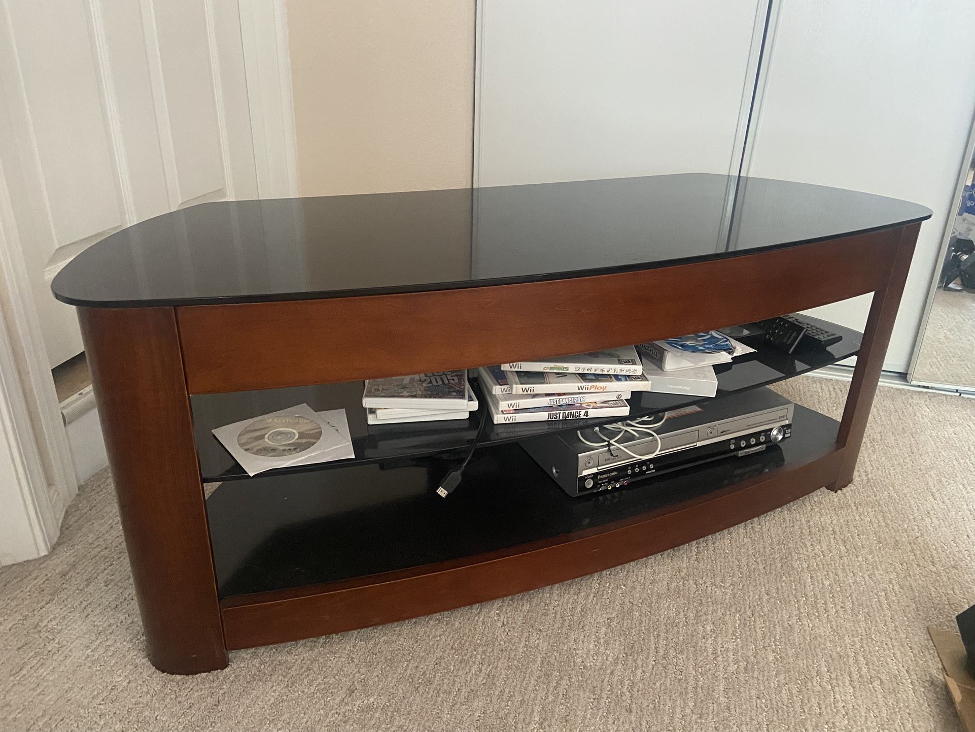 Great condition tv stand with tempered glass shelves modern look and sturdy enough to support medium to large TV and all other belongings. Looks great in living room.