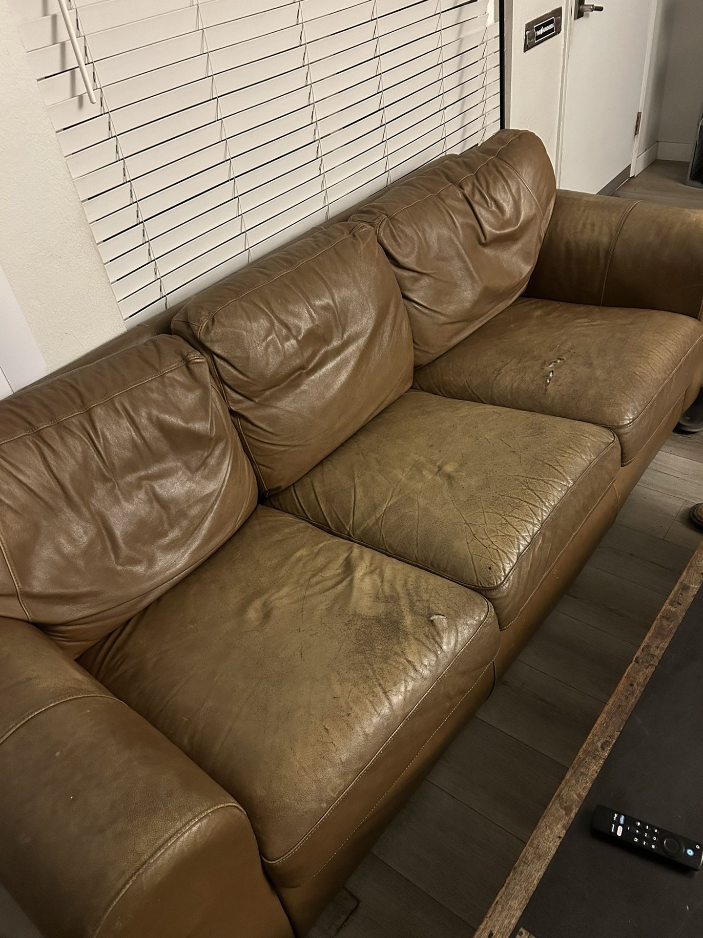 Nice brown leather couch. 82x33. A couple small rips on one cushion but otherwise in good condition! Very comfy
