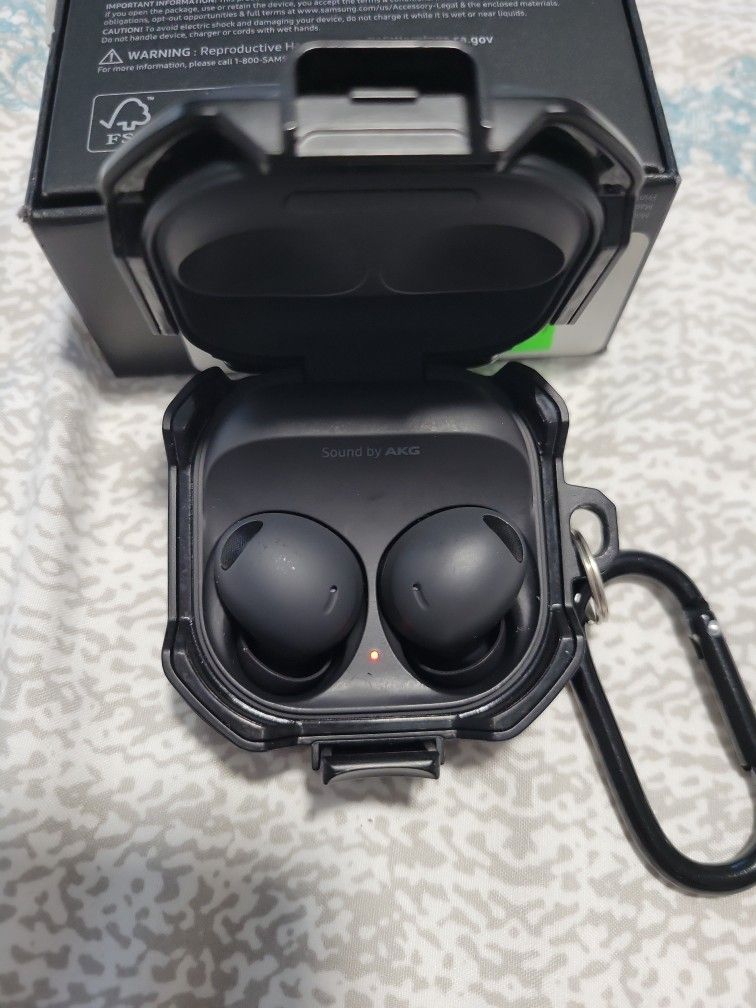 In excellent condition bought them brand new barely used clean case and also comes with a shockproof carrying case easy to clip on to anything has everything we need in the box.
