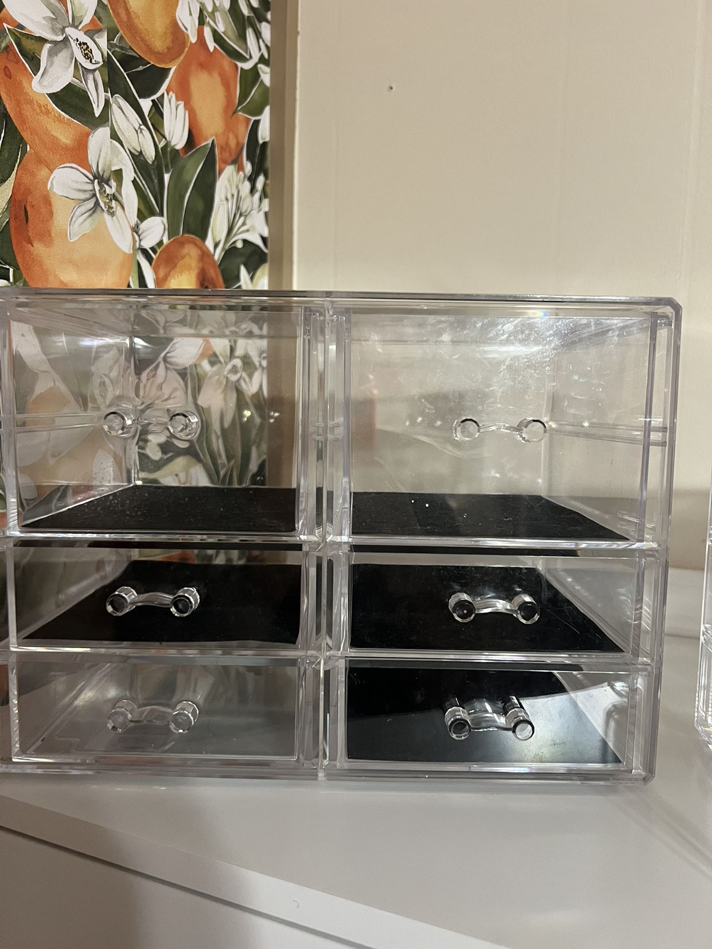 3 stackable makeup organizer Pic #1 (with black bottom) : 8H x 12W x 7D $15 Pic #2 : 6H x 12W x 7D $10 Pic #3 (last) : 4H x 9W x 5D $5 Some normal wear and tear scratches. $25 all obo