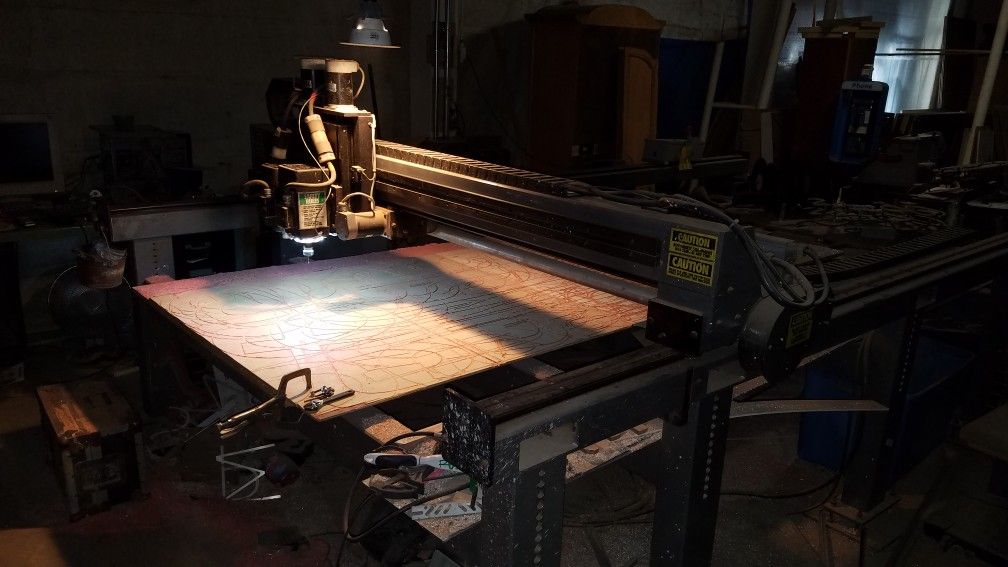 Dual head cnc router, 8' x 14'8" footprint! Cuts 60"+ by almost 14 feet long. Excellent machine for large projects, with a 3 horse and 5 horse Perske spindle heads, adjustable frequency drives. Up to 300 in per minute speed feeds. Comes with a good software package capable of 3D Milling, this machine can handle about 6 in of Z Gantry height milling. It has primarily been used to cut MDF, lightweight aluminum, and Plastics. Can handle cutting up to half inch thick aluminum in one pass... but seldom do I use it like that. Maybe willing to rent machine, or work out payments. Easy to set up and move. Currently have it disassembled and in storage. Comes with a 3-phase 5 horsepower vacuum ring compressor for hold down capabilities, I simply clamp or screw materials down for the most secure method of Milling.