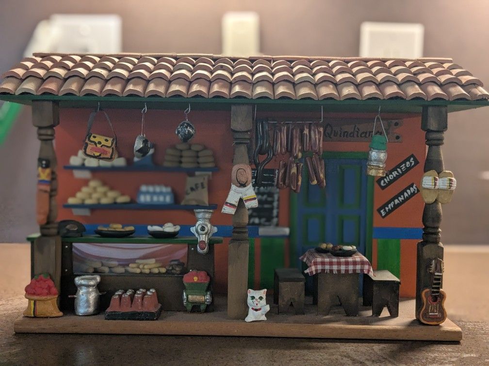 Add a touch of Latin American charm to your home with this intricately crafted diorama of a traditional Colombian market stall. Made with love and attention to detail, this miniature masterpiece features: A vibrant orange building with a terracotta-tiled roof A variety of hanging goods, including chorizos and empanadas A bustling market scene with fruits, vegetables, and more A adorable white cat adding a playful touch This one-of-a-kind piece is perfect for: Latin American enthusiasts Foodies Collectors of unique decor Anyone looking to add a pop of color and culture to their space *Price:* $250 OBO *Condition:* Handmade, one-of-a-kind piece. See pics for condition. One of the items is cracked. If you're interested in purchasing this charming diorama, send me a message!