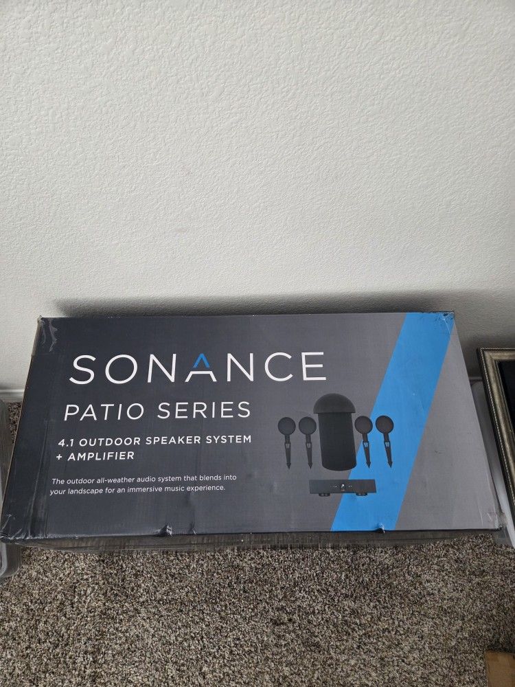 Features product image Sonance - PATIO4.1 W/ 2-100 AMP - Patio Series 4.1-Ch. Outdoor Speaker System with 2-Ch. Amplifier (Each) - Brown/Black Not yet reviewed Not yet reviewed 4.1 Sonance outdoor speaker system with subwoofer and amplifier This outdoor system includes four satellite speakers, one in-ground subwoofer, and a Sonamp 2-100 amplifier for powerful, evenly distributed outdoor audio. Outdoor sound system ideal for patios and garden spaces Engineered for consistent coverage across areas up to 1,000 square feet, expandable to 8.2 channels for even larger spaces. Weather-resistant performance for year-round use Sealed ABS enclosures resist moisture, heat, and corrosion, and are built to handle the harshest outdoor environments. Quick-install ground stakes and daisy-chain wiring Simple layout and wiring design make it easy to install and scale, with included 9" ground stakes and parallel speaker wiring for reliability. Please note: speaker wire is not included and must be purchased separately. Discreet design that disappears into landscaping Neutral earth-tone finish and compact speaker size help the system visually blend into gardens, flowerbeds, and outdoor architecture. What's Included (1) Sonance Sonamp 200W 2.0-Ch. Power Amplifier, (4) 3.5" Satellite Speakers, (1) 8" In-Ground Subwoofer, (8) Silicone Filled Wire Nuts, (4) Removeable speaker stakes with 1/2” NPS threading, (1) Owner's Manual