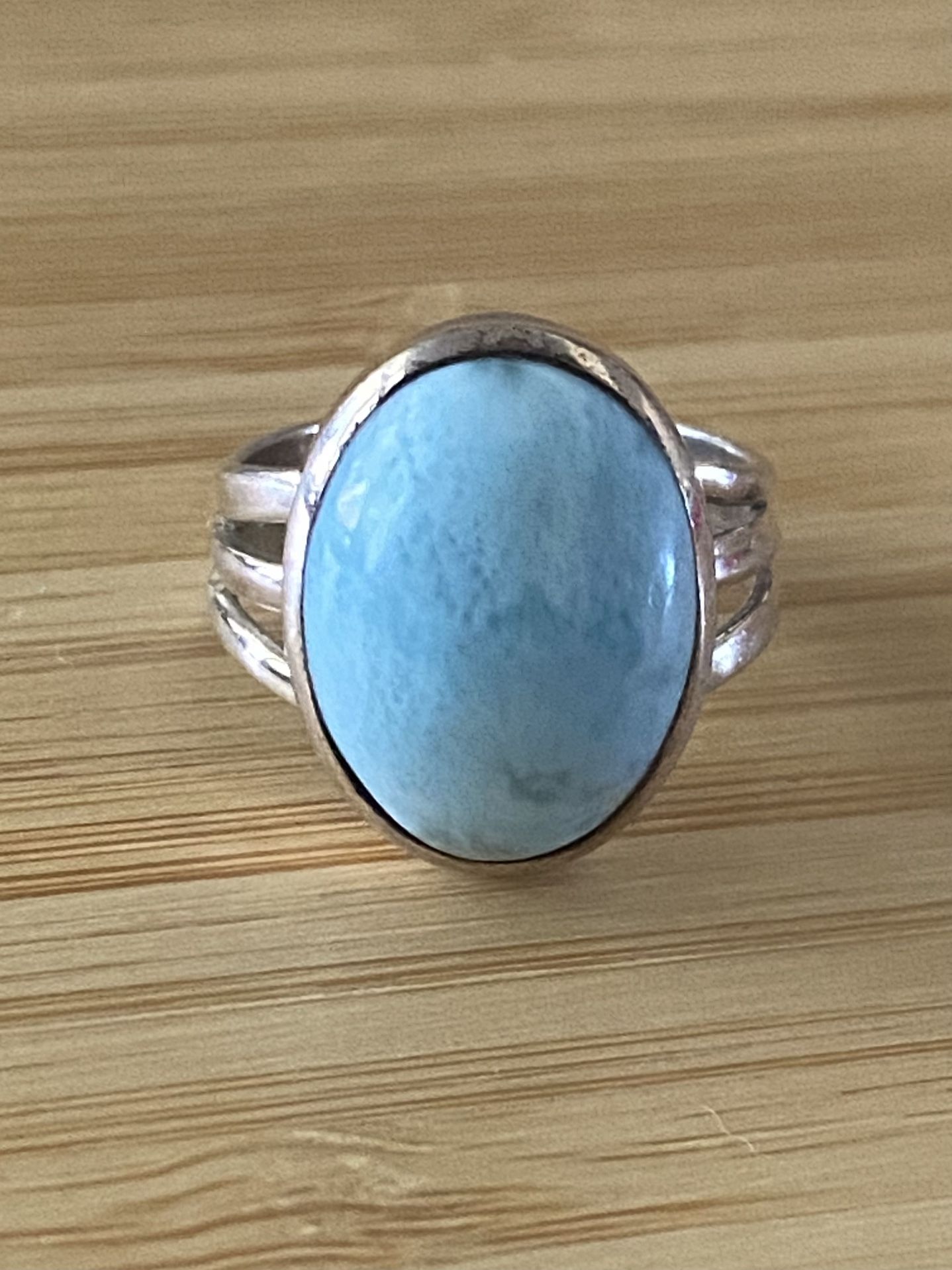 Caribbean Larimar oval ring that makes a statement n a simple but trendy style! The deep, variegated blue arimar cabochon sits in a cool, shiny bezel setting. Larimar cabochon has a unique color and is a great everyday piece full of color. Great for all ages. Wear with a pair if Jeans be or with a Beautiful office Suit. Pre-Loved Size 6