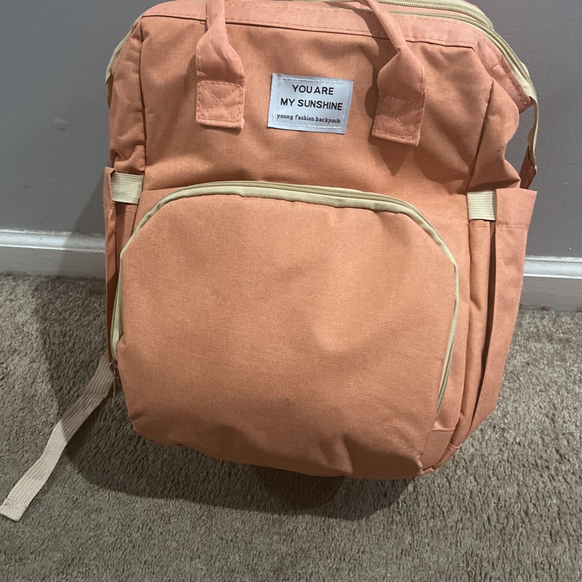 Never used, multifuntional Large capacity, waterproof, insulated bottle pockets, can connect to stroller, side pockets + tissue/wipe pocket, removable design that turns into a sleeper/changing table on the go