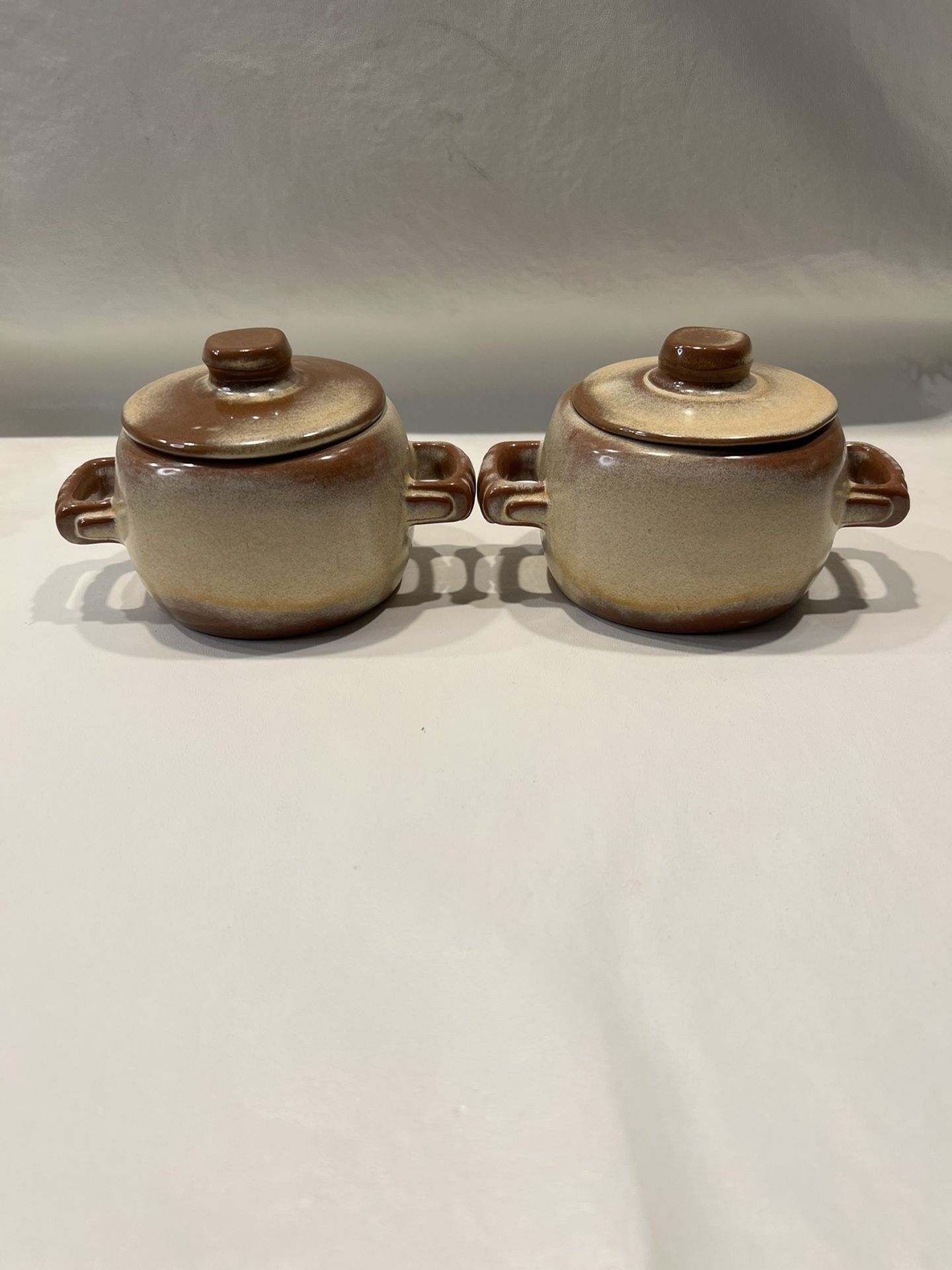 set of 2 Frankoma covered casserole dishes in the plainsman glaze They are in good condition. The bowl is in great condition no chips or cracks or damage of any kind. The other bowl has a chip on inside edge with a slight surface crack on outside does not appear on inside. They measure 4”W x 4”H.