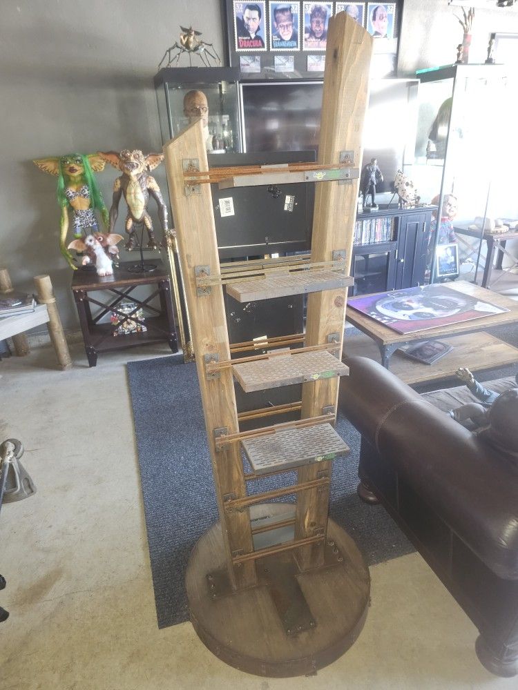 Solid wood witj metal fixtures and base super cool display i use it for bobble heads or anything you would like
